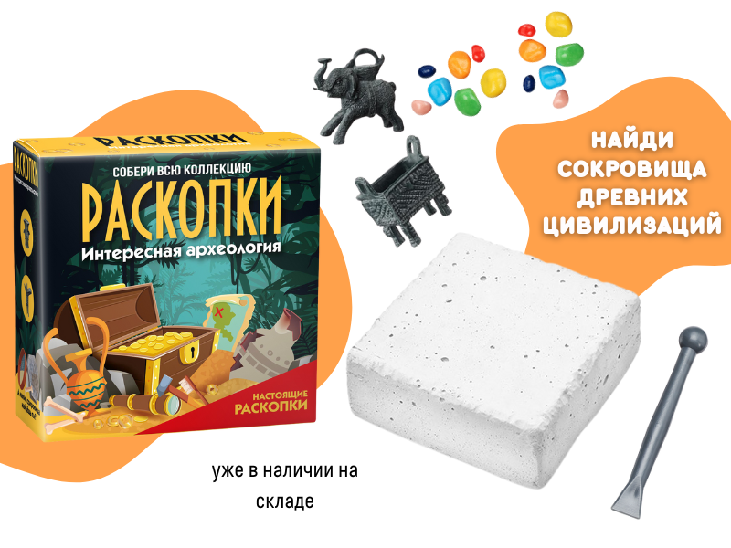 На склад поступил новый набор для раскопок «Интересная археология» с классными находками. Внутри всё необходимое, чтобы сразу начать раскопки: инструкция, прочный стек для раскопок и брусок с находками. Соберите всю коллекцию древних находок и почувствуйте себя настоящим археологом! Узнать больше о новинке можно в разделе.